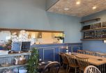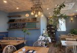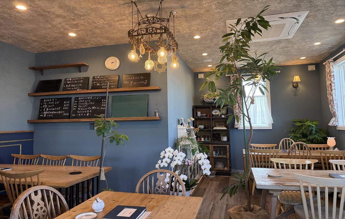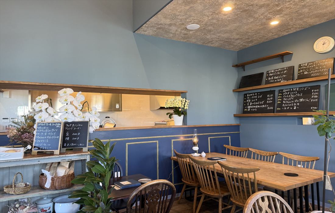 店舗スペースは、パリスブルーの壁とアンティークが映える空間構成。